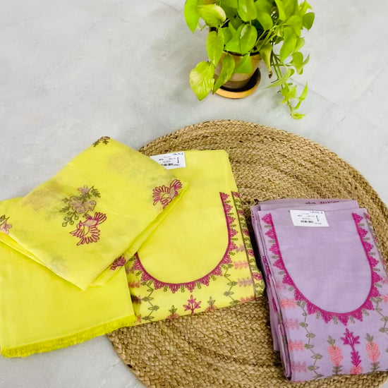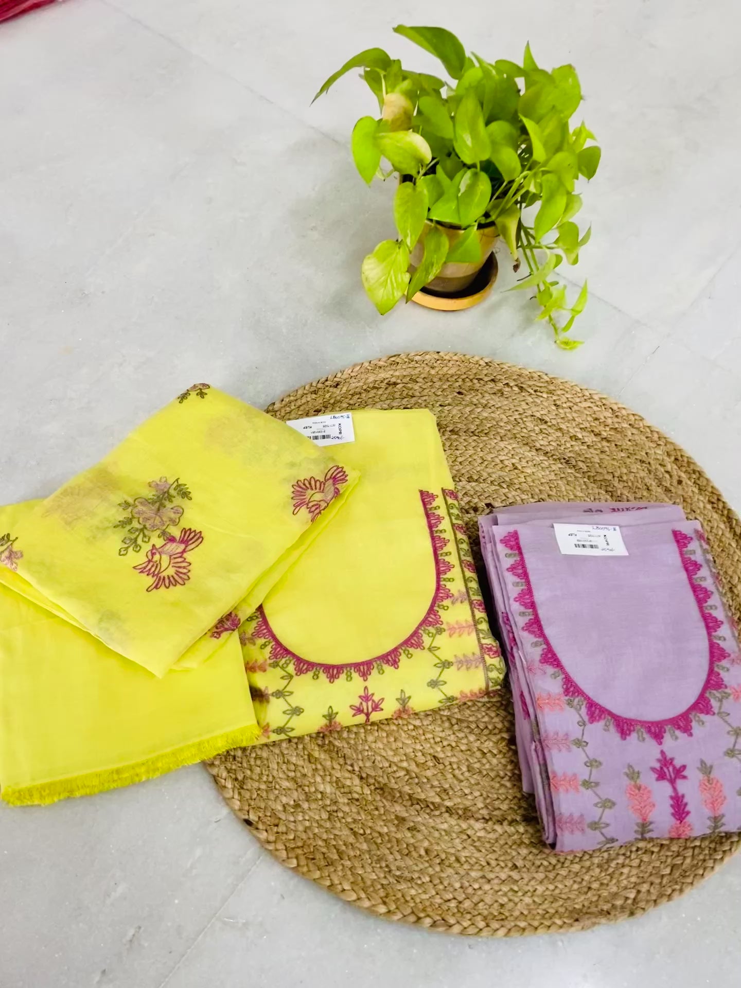 Delicate charm-Yellow and Lavender Mul Chanderi Silk Salwar Suit set beautifully enhanced with intricate embroidery