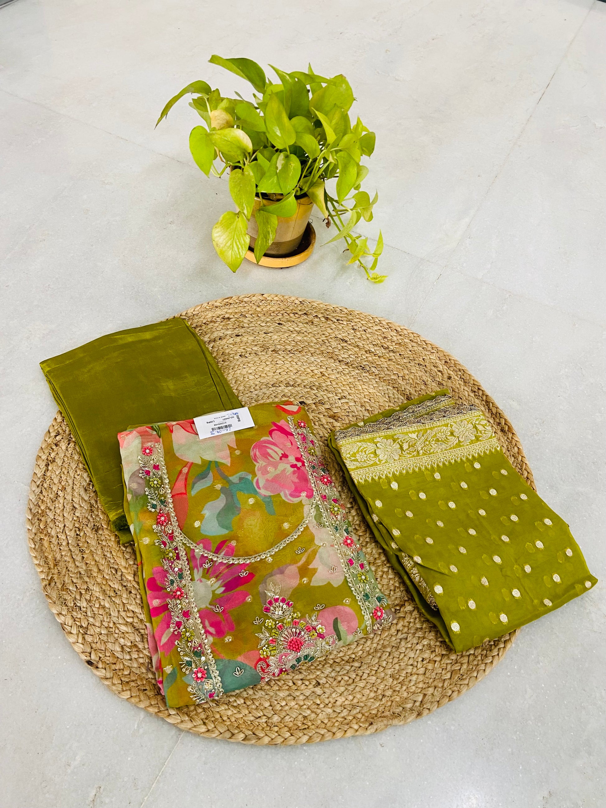 Grace in green-Pure viscose organza Salwar Suit set,exquisitely adorned with delicate thread and zardosi work for a timelessly elegant work.