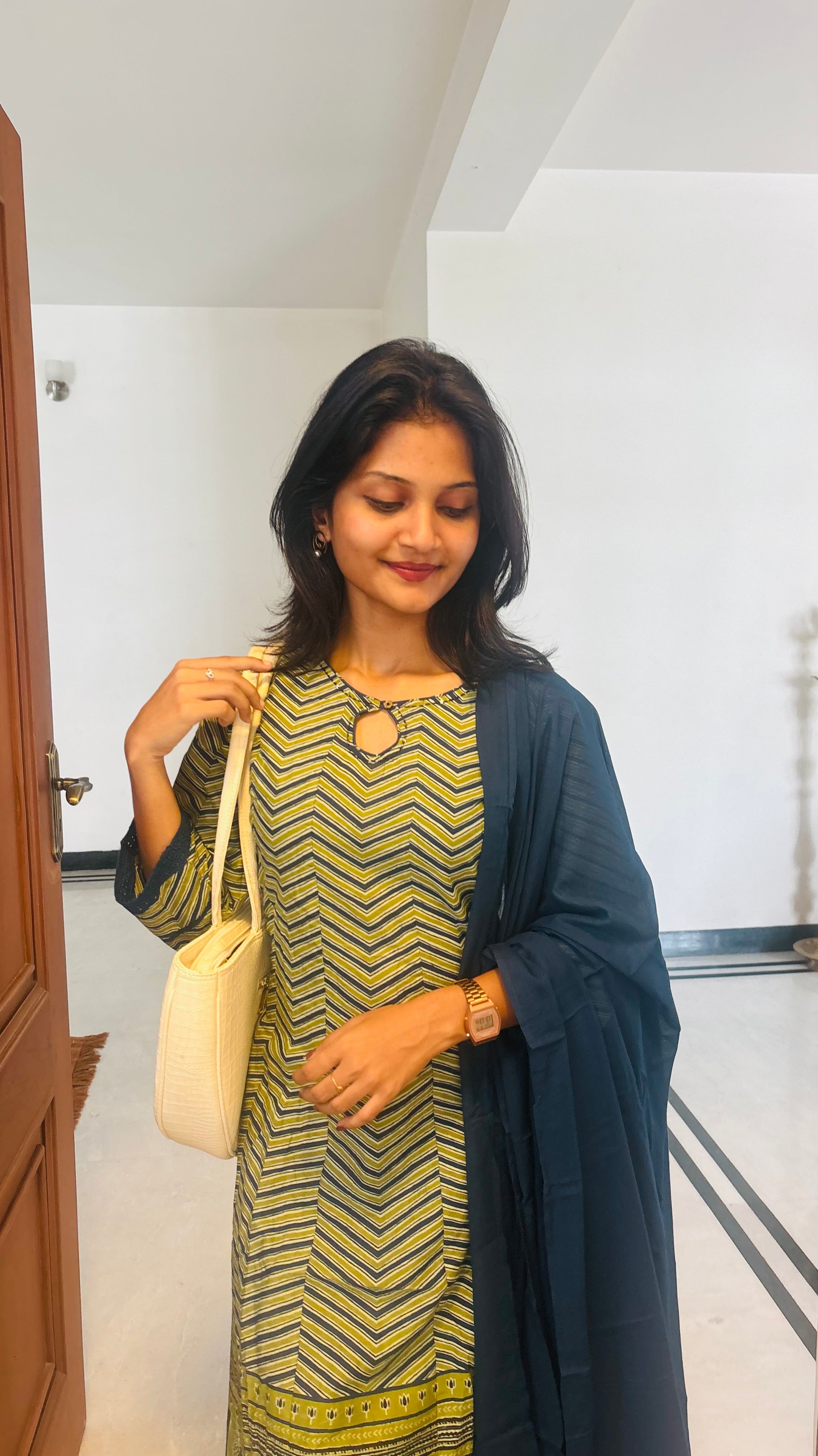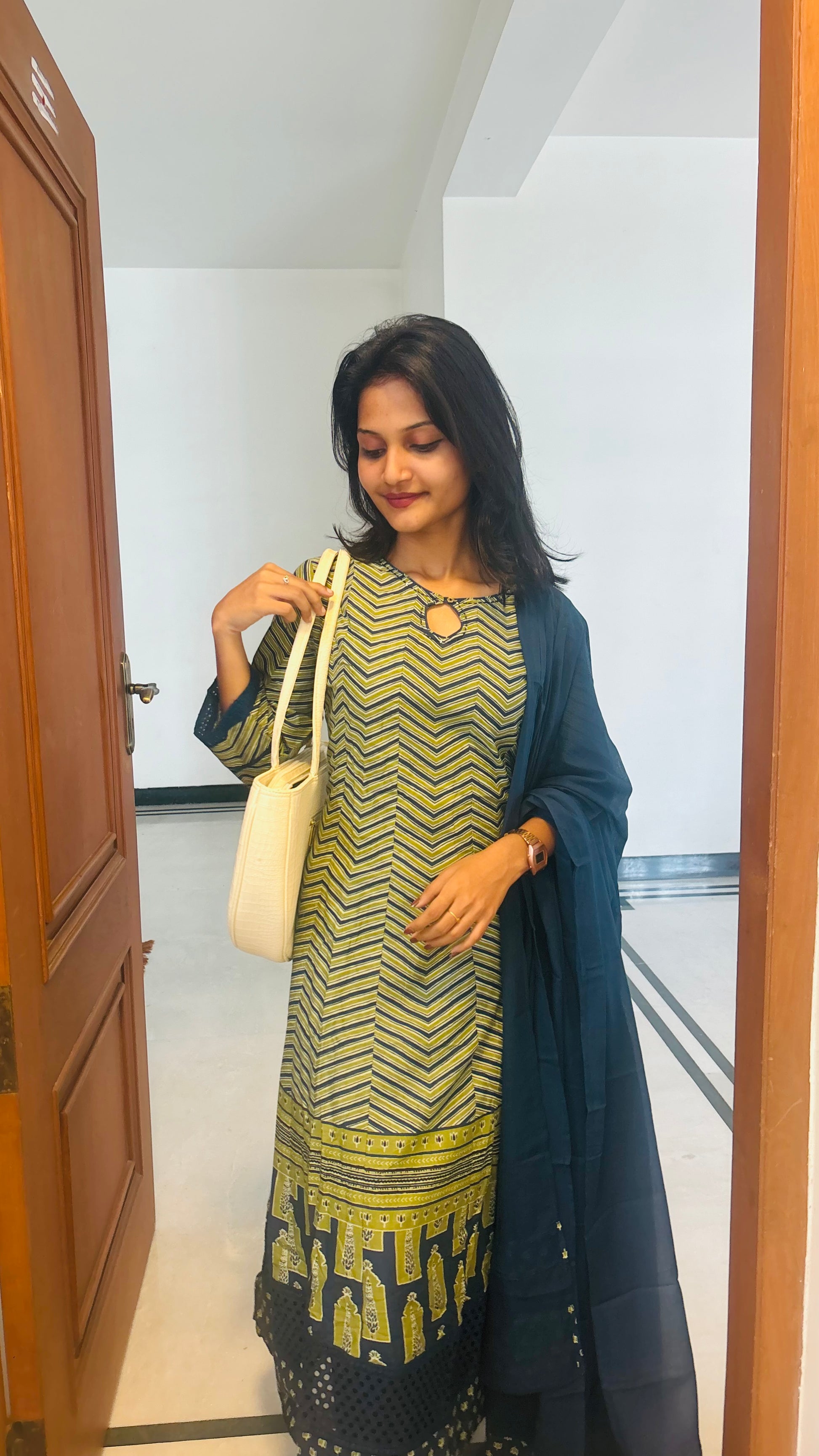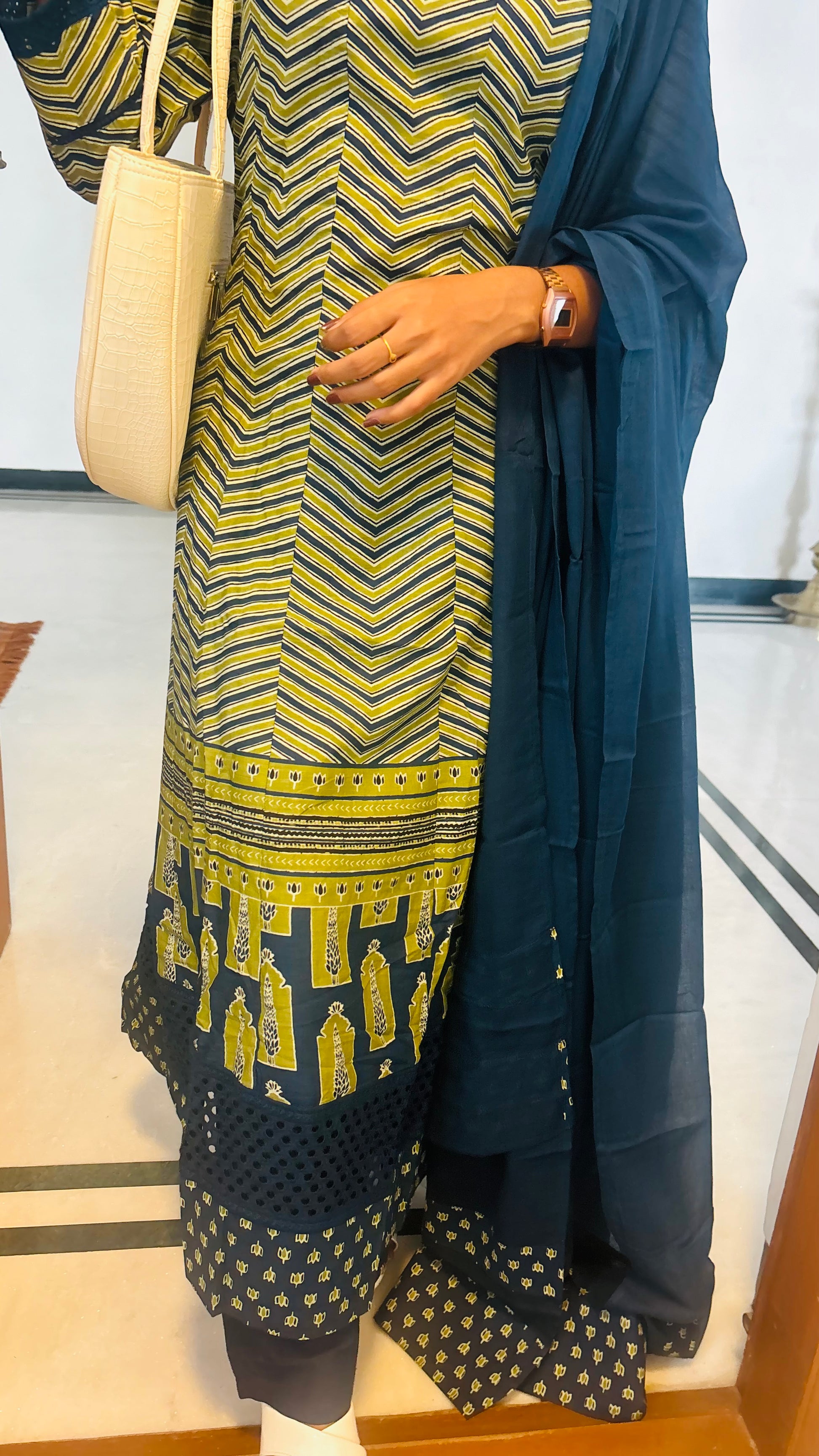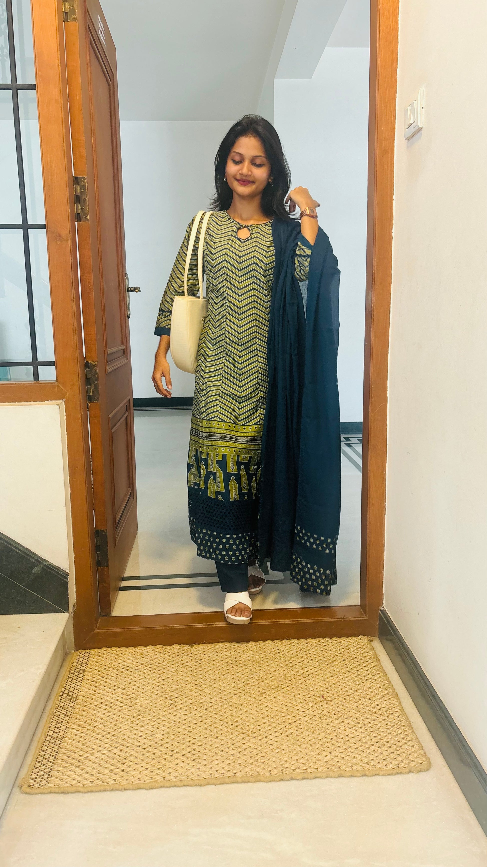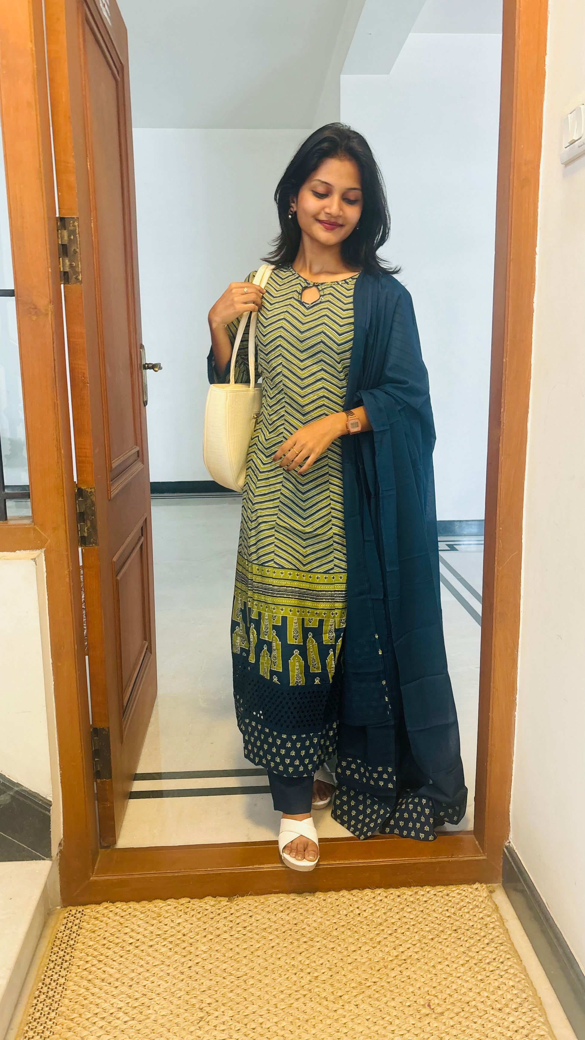 Cool elegance in blue- cotton Salwar suit set with delicate Hakoba detailing beneath for subtle charm.