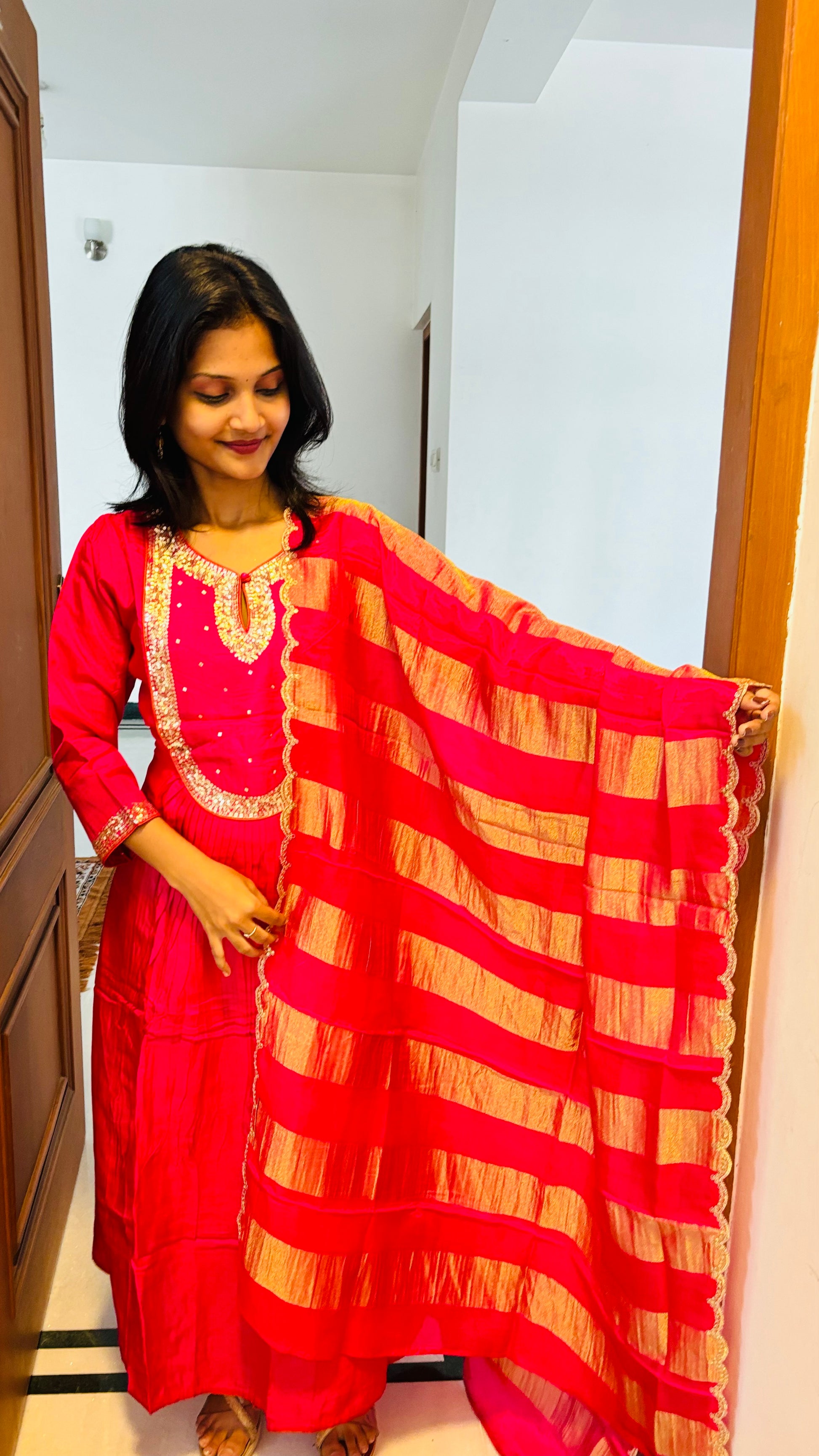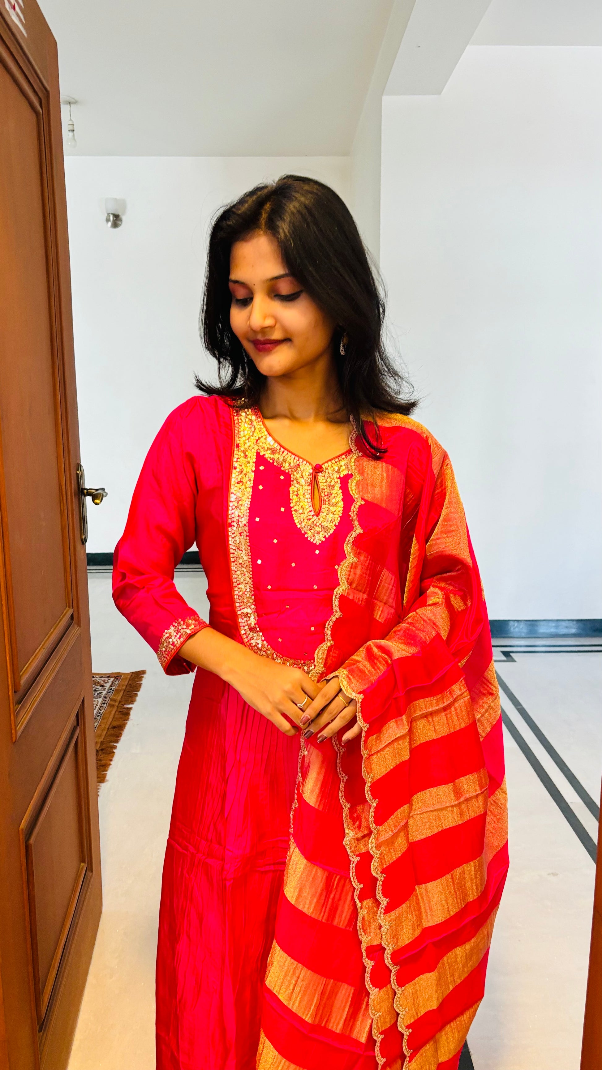 Radiate elegance in this pink Muslin Silk  Silk Salwar Suit Set ,paired with a delicate Organza dupatta for a graceful finish.