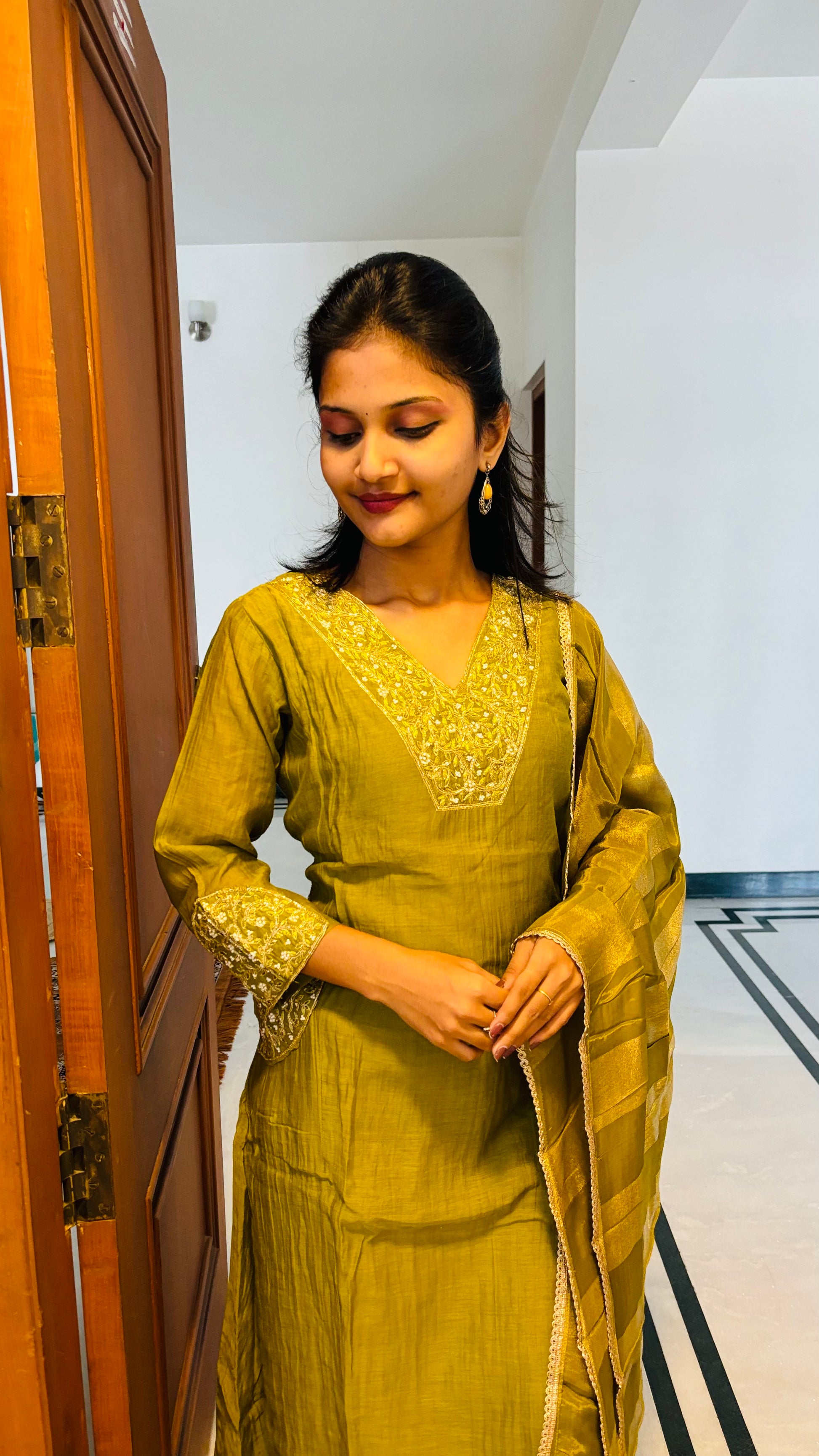 Radiate elegance in this green Mul Chanderi Silk Salwar Suit Set ,paired with a delicate Organza dupatta for a graceful finish.