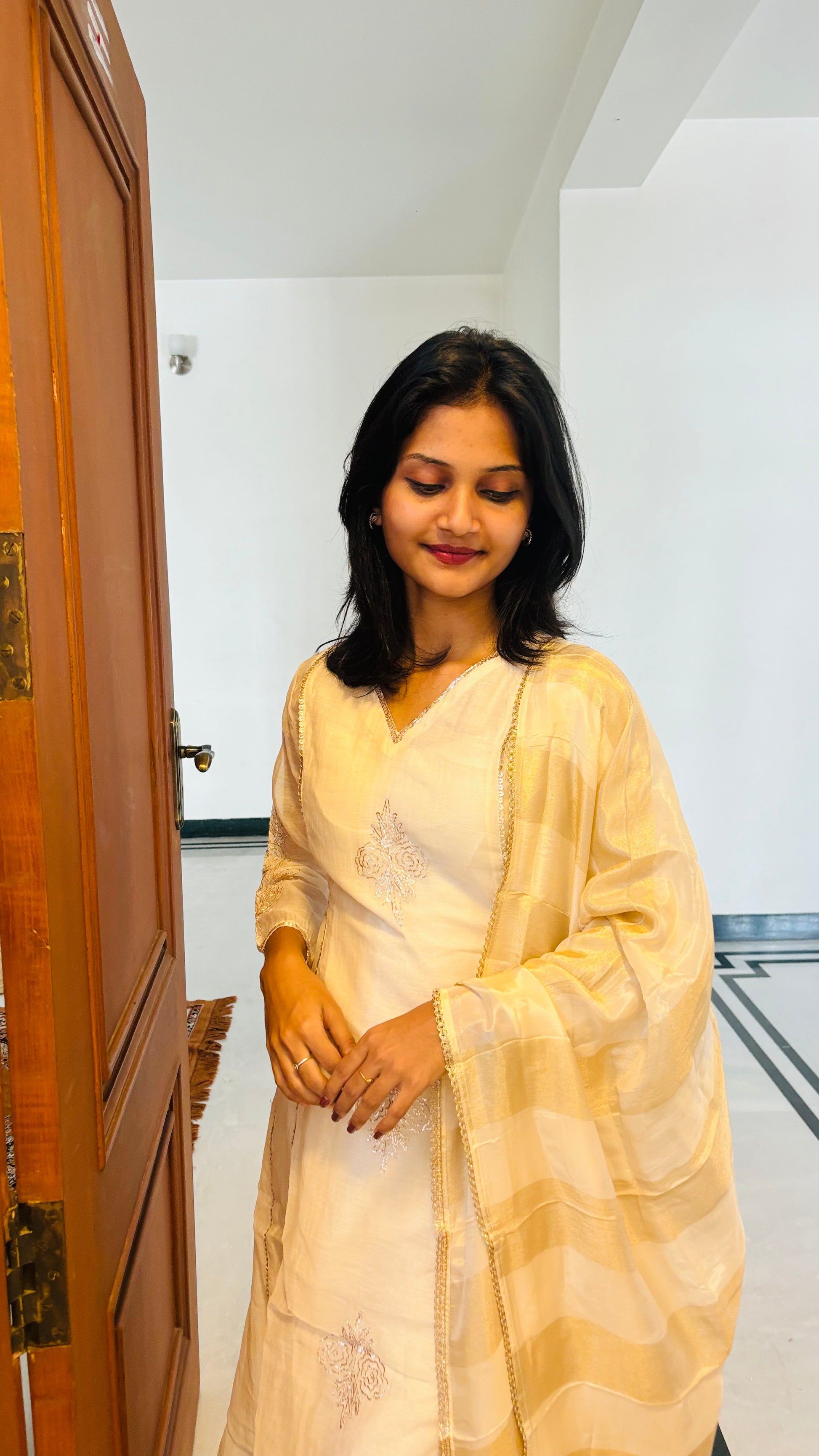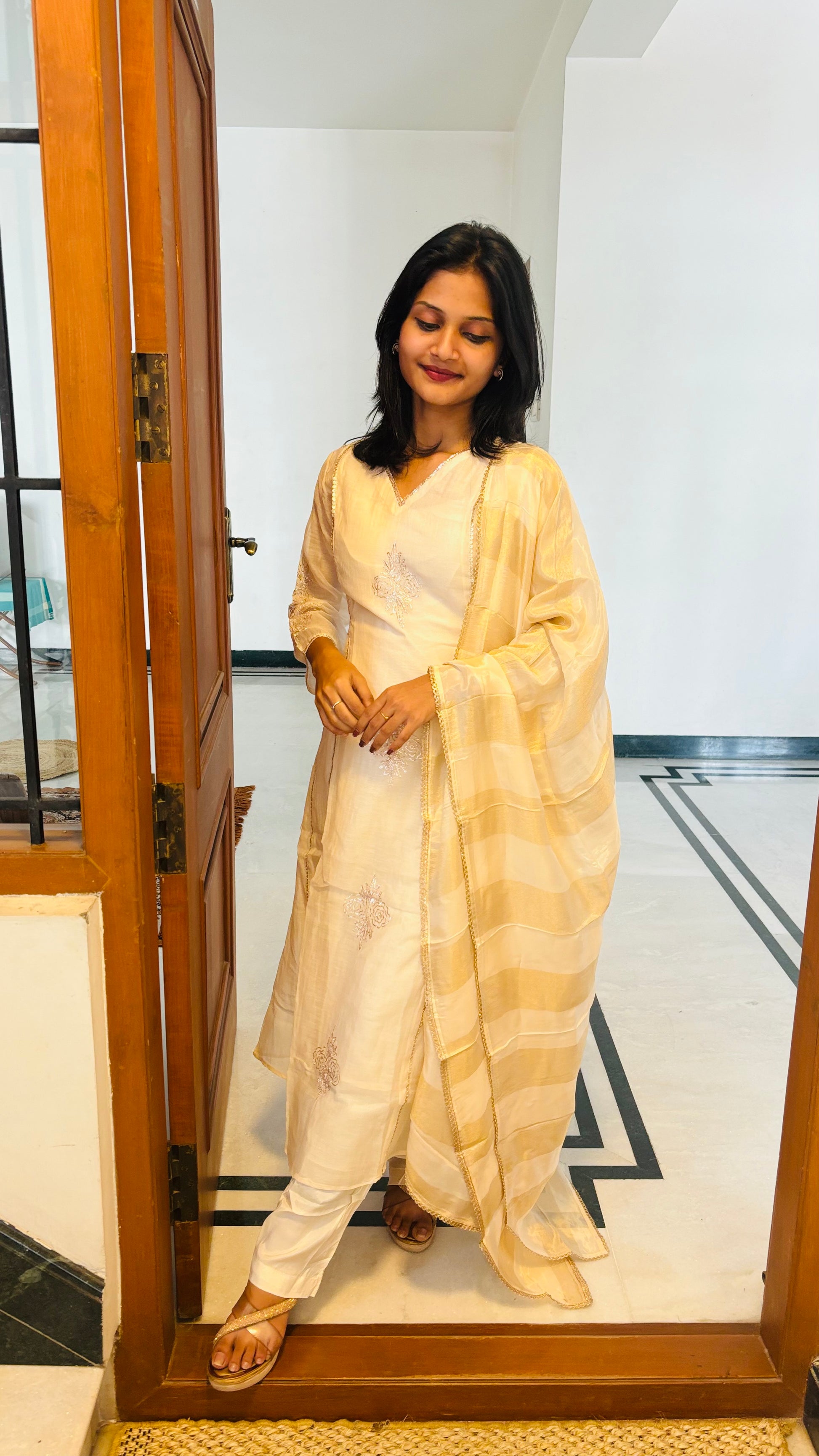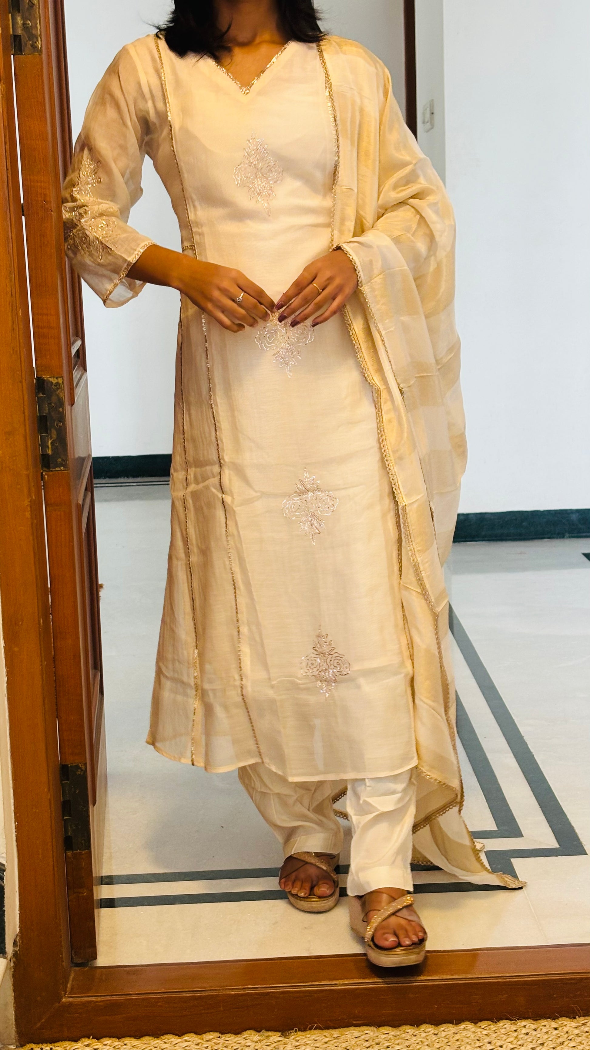 Radiate elegance in this White Mul Chander Silk Salwar Suit Set, paired with Organza dupatta for a graceful finish.