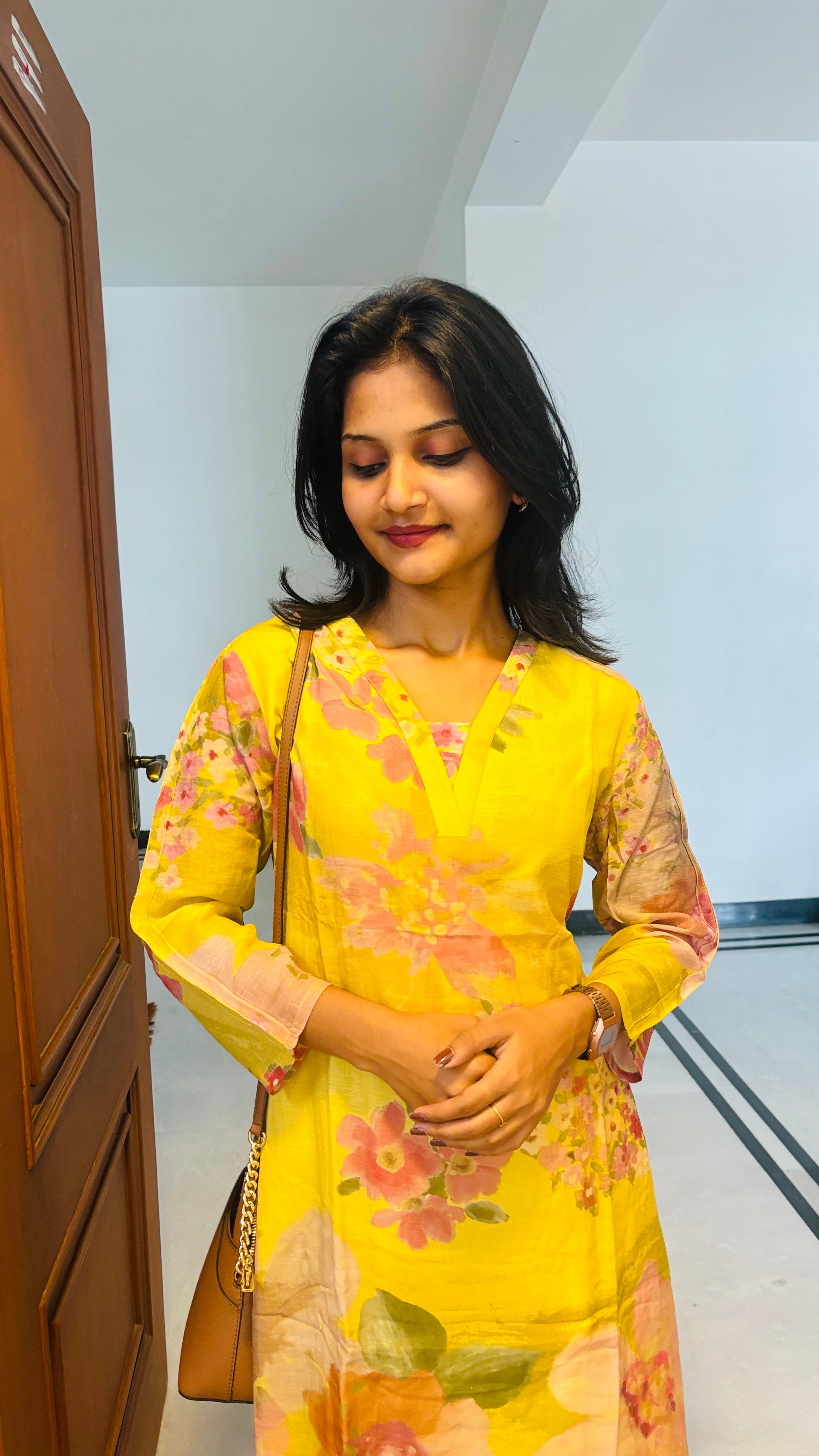 Glow with elegance in our Yellow Mul Chanderi silk Salwar set,paired with flowy palazzo pants for timeless charm.