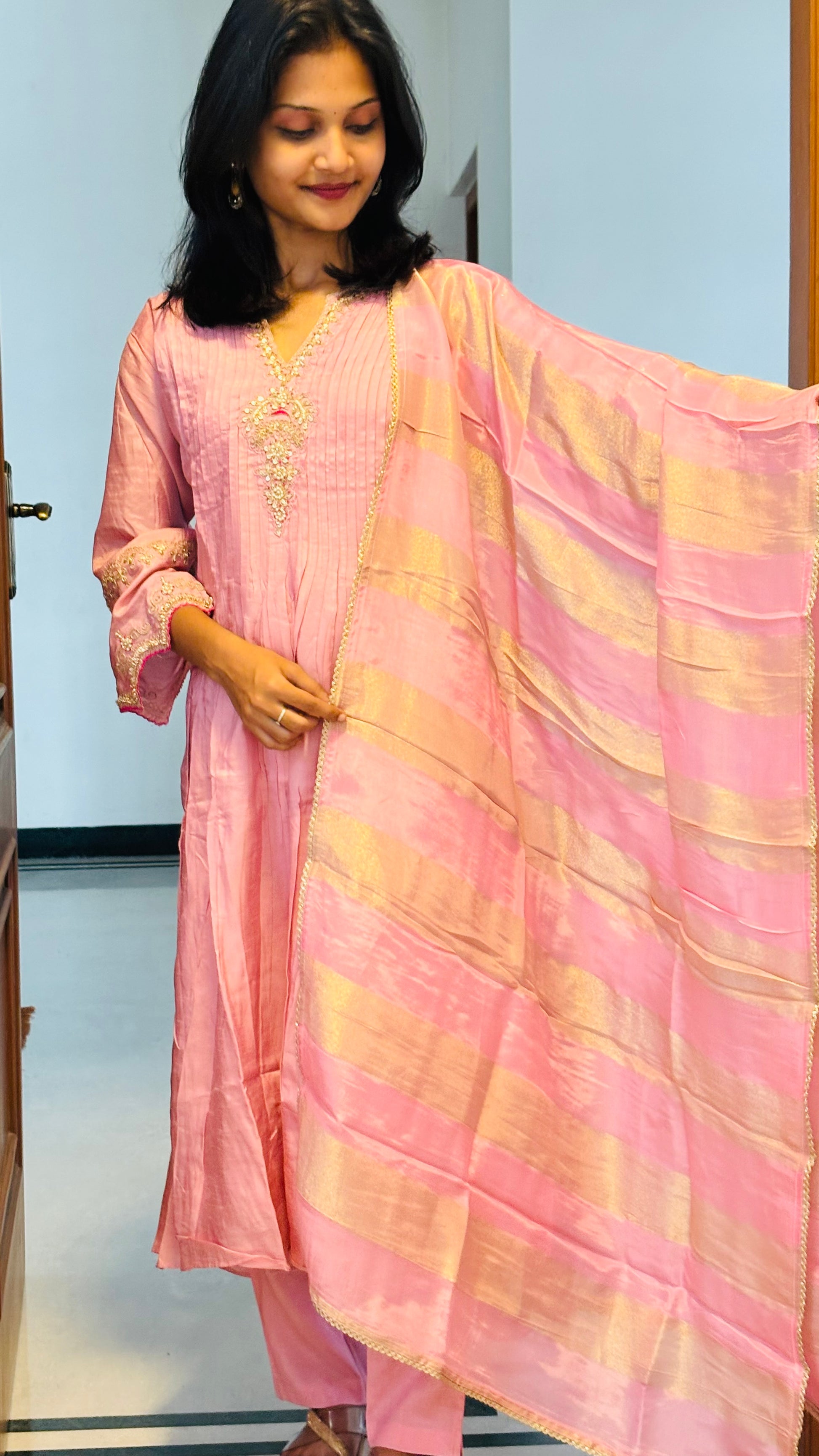 Radiate elegance in this baby  Pink Muslin Silk Salwar Suit Set, paired with Organza dupatta for a graceful finish.
