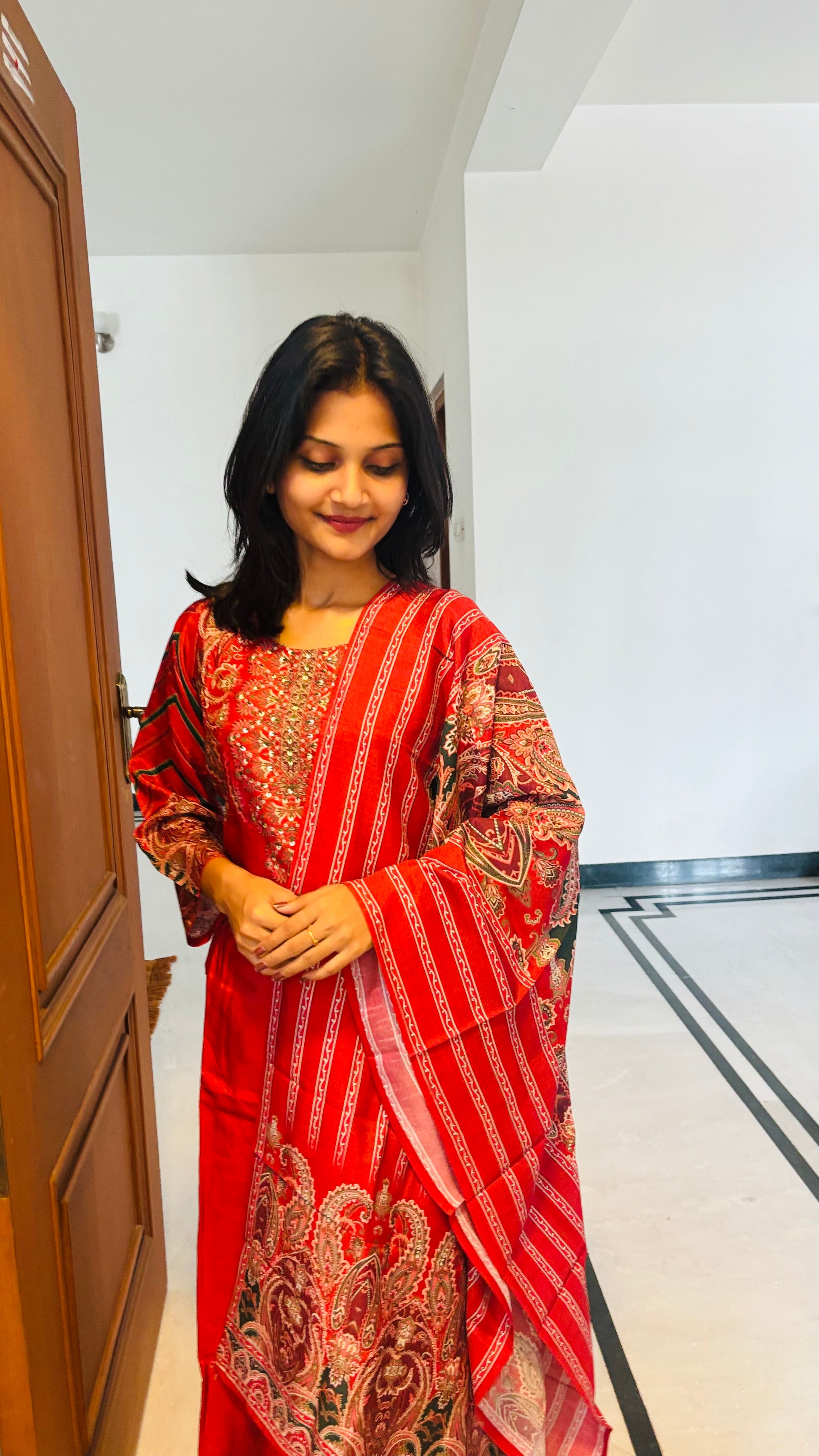 Radiant in red-semi modal Salwar suit set that blends comfort with refined elegance.