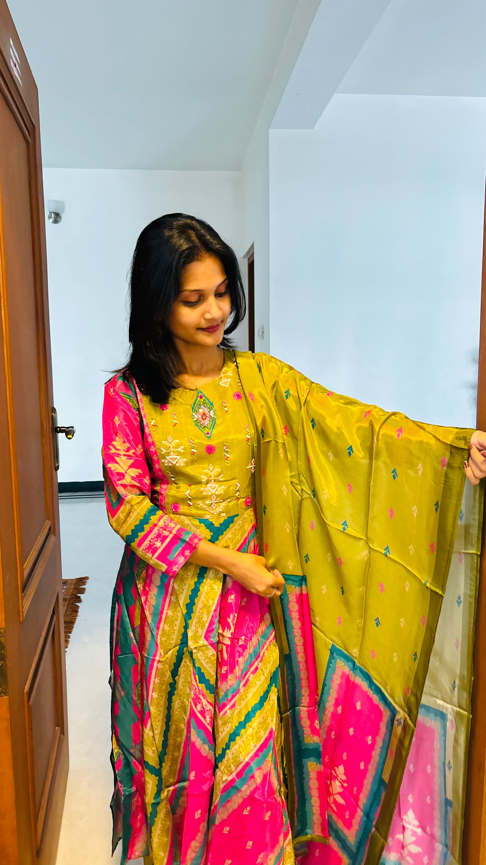 A burst of colours in flowing Crepe-multicoloured Salwar suit set made for effortless elegance.