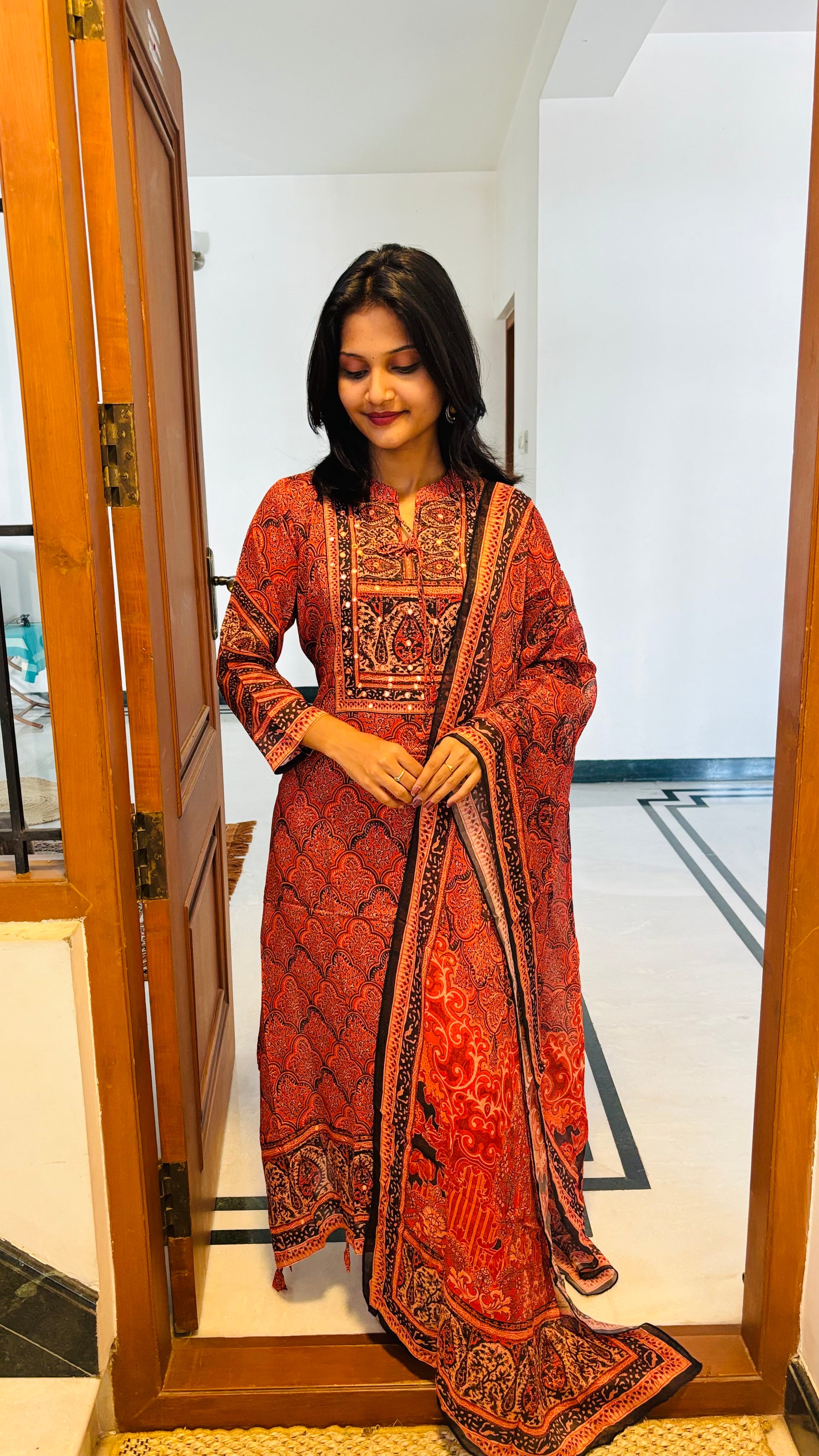 Bold in black and bright in Orange - Chinon silk Salwar Suit Set that defines festive elegance.