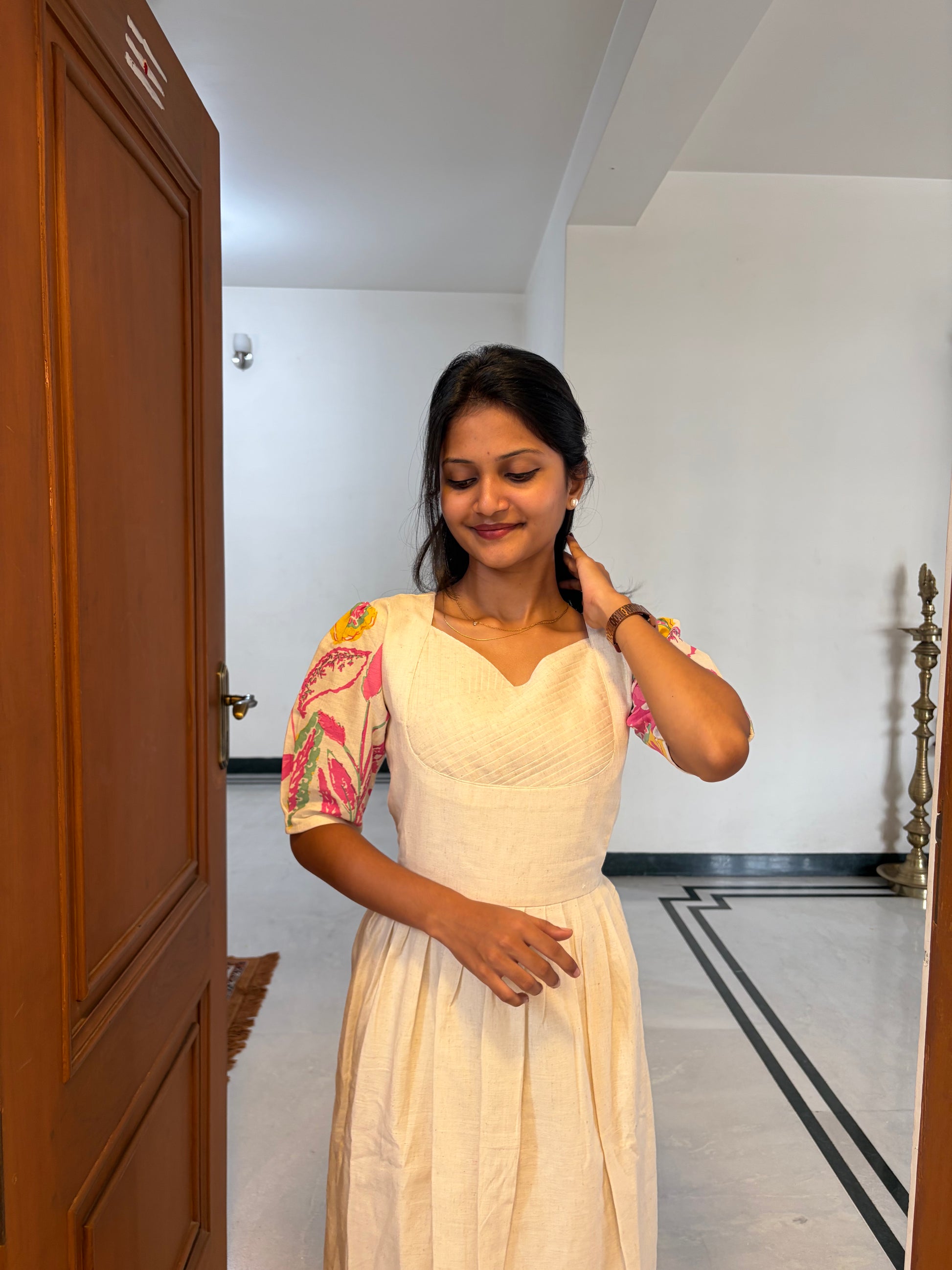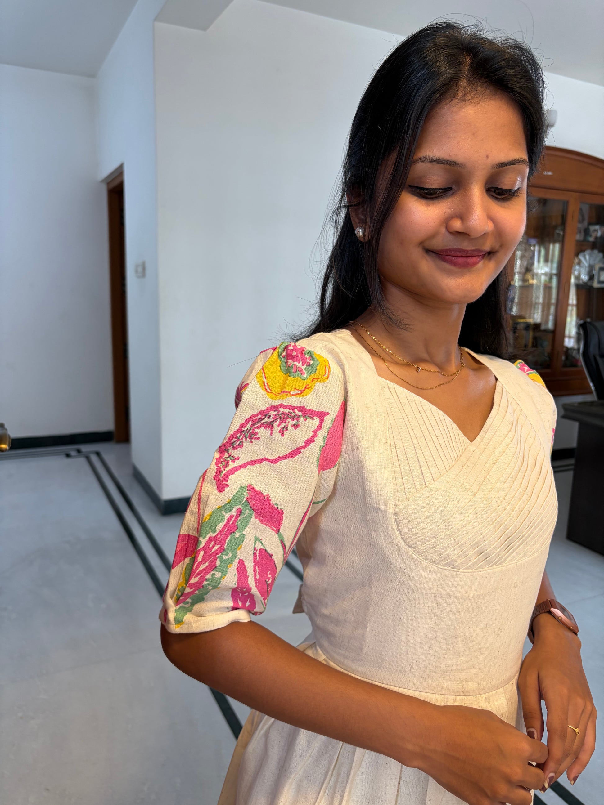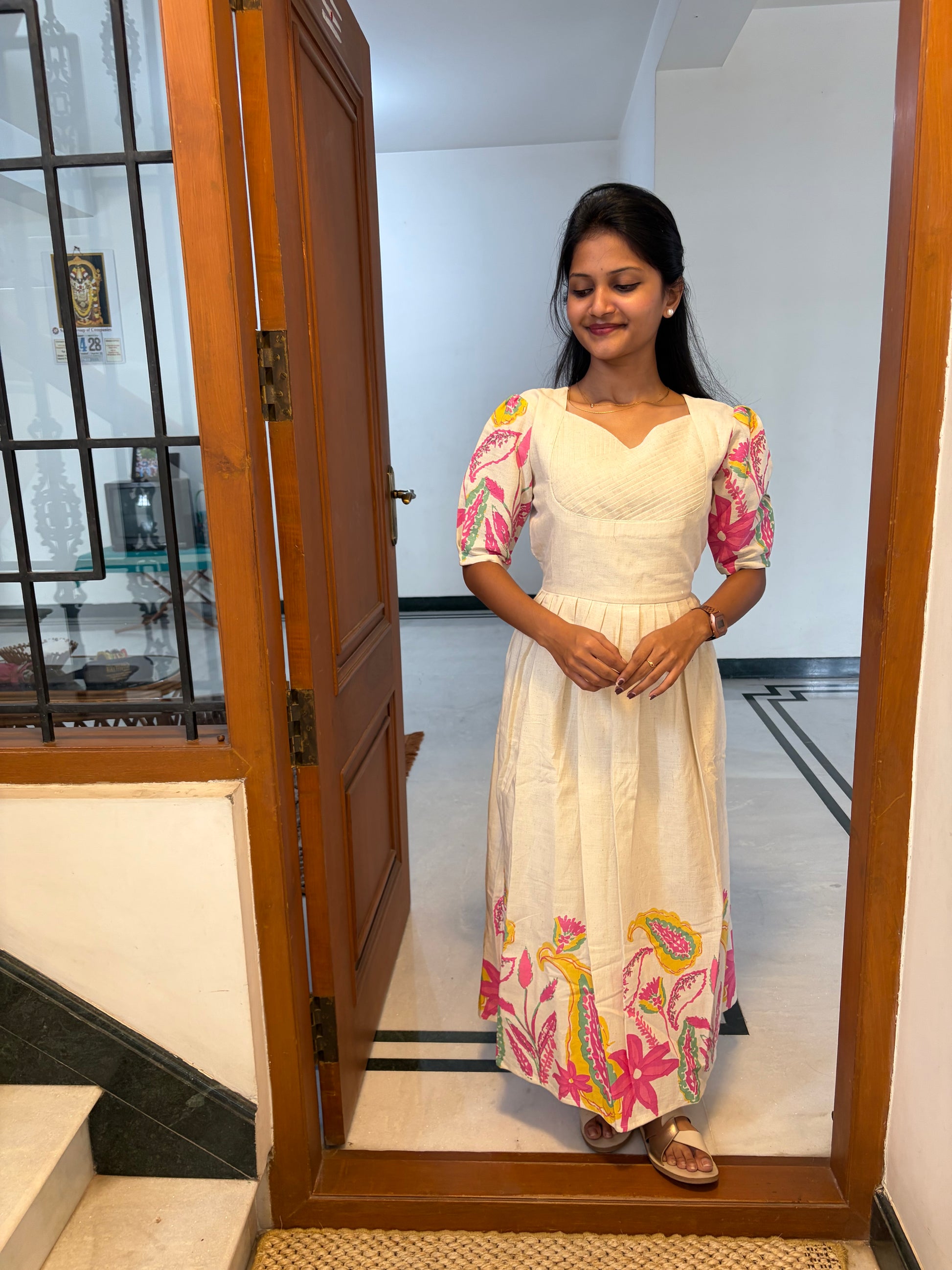 Crafted in soft flex cotton ,this maxi features beautiful pleats along the yoke line,adding gentle structure and charm.Adorned with pink and yellow florals throughout,it brings a warm,blooming touch to the winter season.A graceful,feminine pick for effortless everyday elegance.